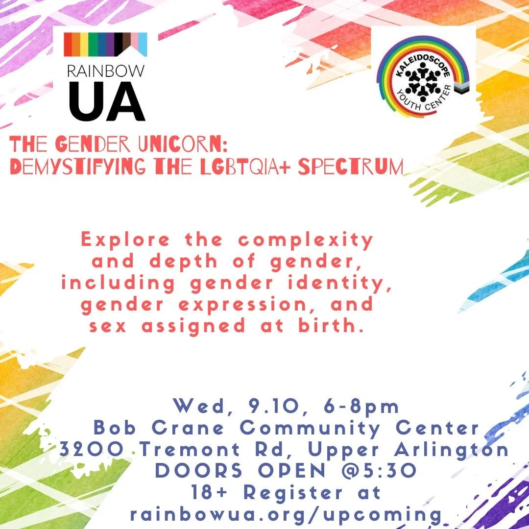 The Gender Unicorn - 2025 Fall Training Series Part 1 Wednesday, September 10, 2025 6:00 PM 8:00 PM Bob Crane Community Center 3200 Tremont Road Upper Arlington, OH, 43221 United States (map) Google Calendar ICS Register Here